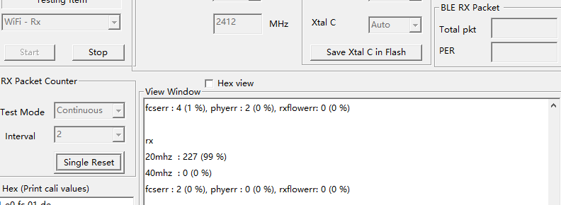 “Continous” mode: the instrument transmits continuously, the chip continues to receive. The datum are received within 2 seconds “Interval”. The correct rate of receiving packets is printed in the “View Window” box. Note that in this mode, the chip does not count the lost packets, and only calculates the correct rate of received packets. So the correct rate of the packets seen 99% (in parentheses in the figure) is Not credible, but the correct number of packets received before the parentheses in the above figure 227 is credible, You can use the signal source to send a large signal (to make sure that the instrument receives all the packets and does not lose any packets) to count how many packets the instrument has sent in total. And the 227 divide the total packets get the total packet error rate PER.