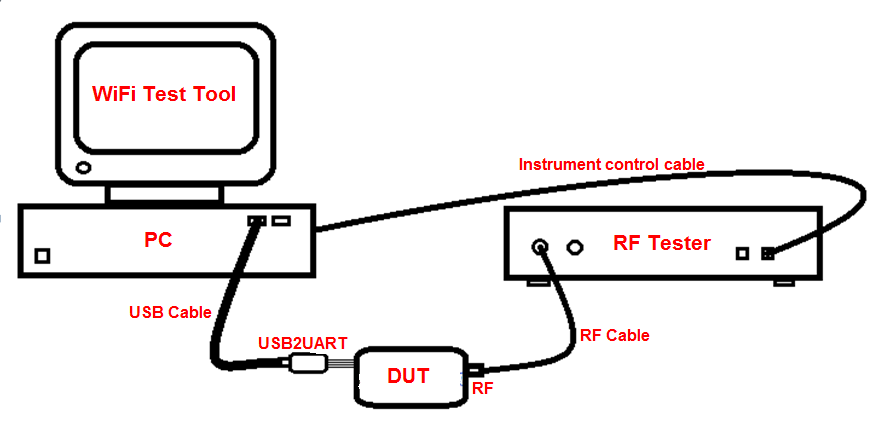 硬件连接如图所示:最左边是RF线连射频仪器,中间四根线为串口通信线,其中红色的为电源,在测试接口上有标注V(电源)和G(地),对应串口板上的V和G。另外串口板上的黄色跳帽必须插着(标注ATE),如果掉了,需找线短接;如果不是这个串口板,需要在这个UART的TX脚上加下拉1K电阻到地。1K电阻到地的原理是:当上电的时候UART_TX处于输入上拉状态(内部上拉电阻大概几十K),发现外部接1K电阻到地时就判断为输入低电平,芯片直接进入测试模式用于测射频性能,进入模式后,端口又设置为正常的UART功能,1K下拉电阻不会影响UART正常通信。