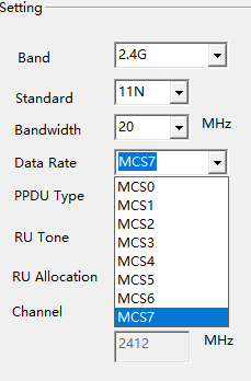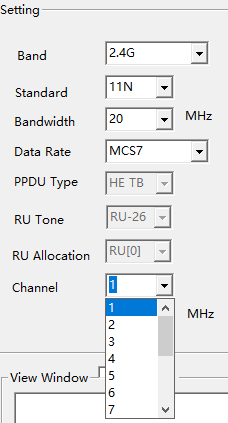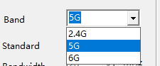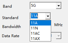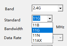 如图,需要测试2.4G的发射接收则选择2.4G,需要测5G发射接收选5G,板子具体支持哪个频段的测试需要看固件有没有做支持.