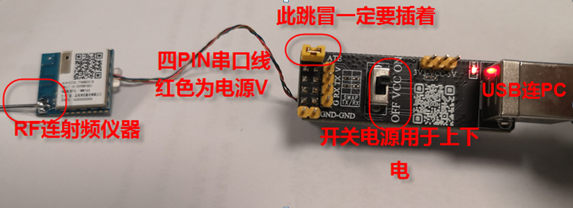 串口板上开关用于模块的上下电,如果发现串口连接不成功,可尝试拨动开关重新上电。最右边USB接口连接电脑PC。